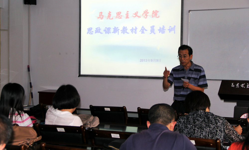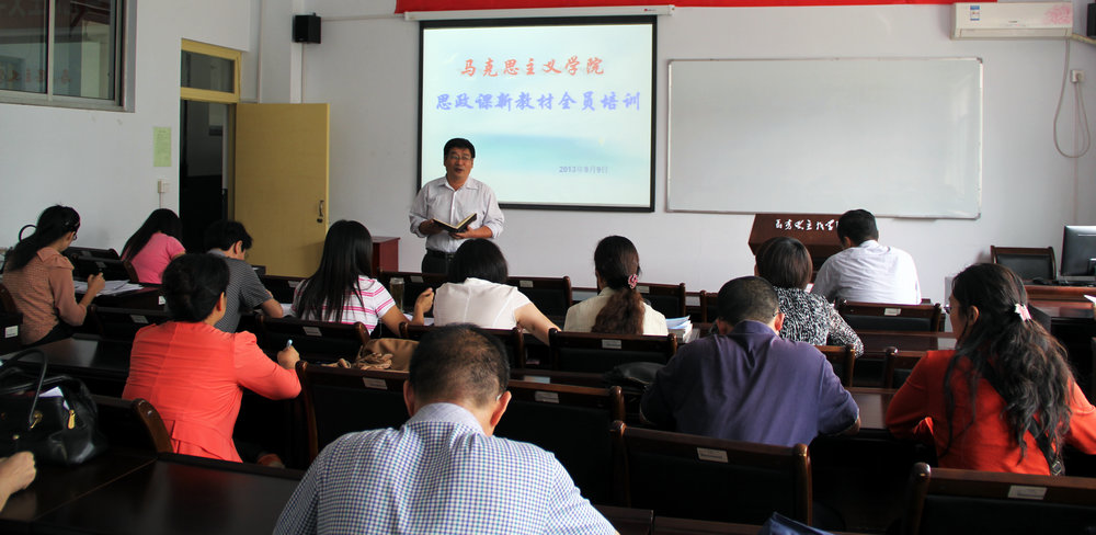为深入贯彻党的十八大精神,深刻理解掌握高校思想政治理论课新修订教材和教学大纲,确保高校思想政治课理论课教学质量,推动马克思主义中国化最新成果进教材、进课堂、进头脑,根据《教育部社科司关于做好高校思想政治理论课新修订教材和教学大纲全员培训暨举办示范培训班的通知》(教社科司函[2013]152号)和《中共山东省委高校工委关于做好高校思政课新教材培训暨举办示范培训班的通知》(鲁高工委通字[2013]66号)精神,我院于9月9日在2号教学楼119报告厅举办了高校思政课2013年新修订教材全员培训,学校参与思政课教学的所有教师参加了培训。会议由房晓军副院长主持。
