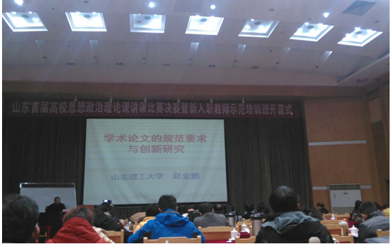 我院赵金鹏教授做客 山东省高校思想政治课教师培训基地作专题学术报告 12月3日下午,应山东省高校思想政治课教师培训基地的邀请,我院赵金鹏教授做客为“山东首届高校思想政治课讲课比赛决赛暨新入职教师示范培训班”学员做了“学术论文的规范要求与创新研究”的专题报告。