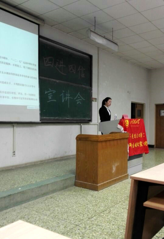 时政宣讲团走进建筑工程学院 ——开展“四进四信”学习会 4月20日下午,我院研究生时政宣讲团应建筑工程学院邀请,在4号教学楼101多媒体教室,对建筑工程学院学生会干部及入党极分子,进行了以“四进四信”为主题的宣讲活动。