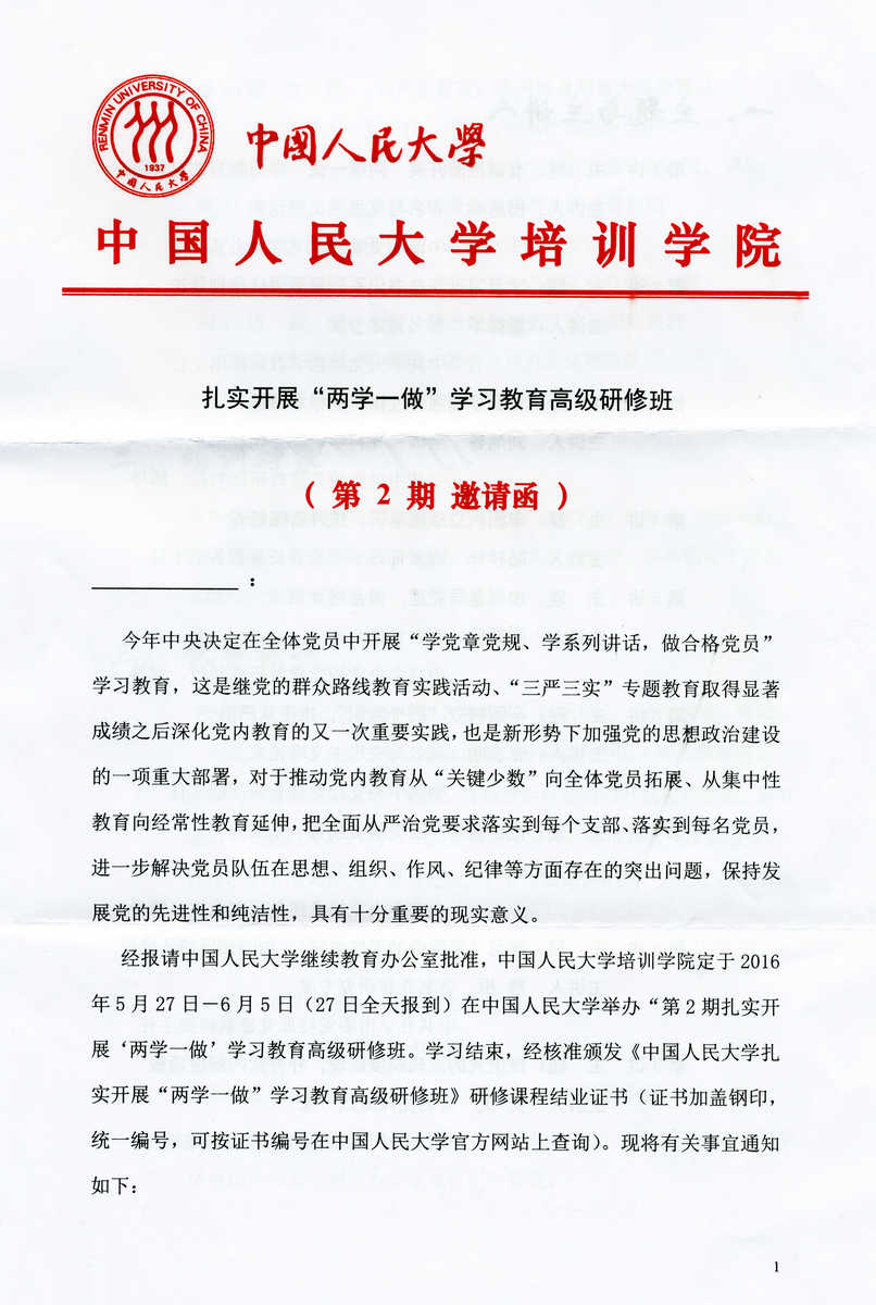 现将中国人民大学培训学院《扎实开展“两学一做”学习教育高级研修班》(第2期邀请函)全文转发如下,如要参加,请于5月7日前向学院申请。