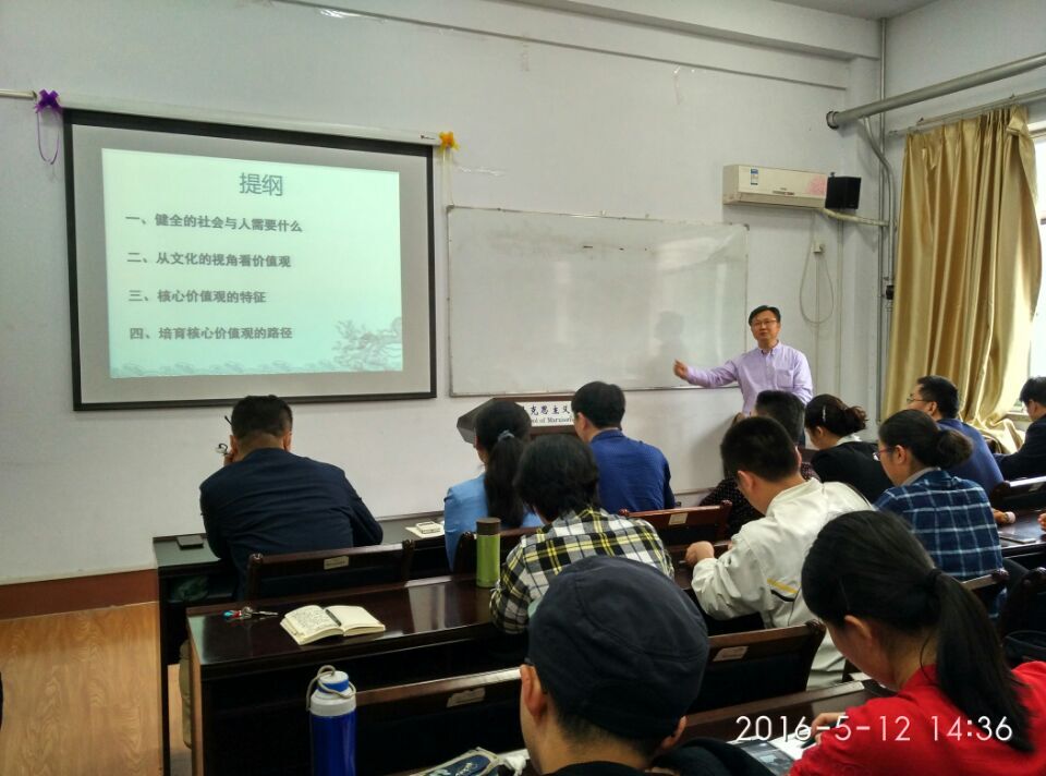 郝立新教授从健全的社会与人需要什么、从文化的视角看价值观、核心价值观的特征、培育核心价值观的路径等四个方面详细介绍了中国当代价值观的有关问题。郝立新教授引用习近平总书记关于文化的三个比喻“补钙”、“把好总开关”、“系好第一颗纽扣”,强调我们的时代和社会需要文化自觉和价值观的自觉。文化的核心是价值观,价值观是文化的内核和灵魂,文化在吸纳民族和时代的特点,反映不同民族诉求的同时,也受特定的时代、制度和实践的限制,当前我们应弘扬历史唯物主义文化观。当谈到当代中国的主流价值观念是在中国特色社会主义实践基础上产生时,教授从“主导性、普遍性、超越性、包容性”四个方面阐述了核心价值观的特点。教授引用习近平总书记在“五四”讲话中讲到的“国之四维”、“三位一体”等概念,告诫我们要立足中国优秀传统文化和历史践行社会主义核心价值观。在谈到培育核心价值观的路径问题时,郝立新教授指出我们在培育和践行核心价值观的过程中要注重学习和实践相结合,把工作落细、落小、落实,实现我国传统文化的创新性转化和创造性发展。他通过分享习总书记六一讲话精神,指出培育和践行社会主义核心价值观要做到记住要求、心有榜样、从小做起、接受帮助。最后,郝立新教授与现场师生进行了互动交流,并回答了师生的提问。