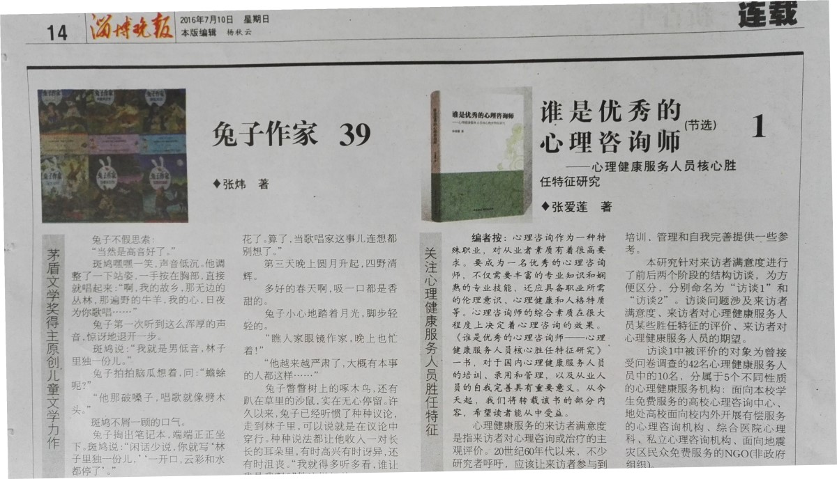 近日,为响应“中华人民共和国国民经济和社会发展第十三个五年规划纲要”提出的“健全社会心理服务体系,加强对特殊人群的心理疏导和矫治”,以及“加强心理健康服务”、“推进健康中国建设”的战略要求与部署,《淄博晚报》与williamhill英国认真探索服务于英国威廉集团和淄博市“校城融合发展”的方式方法,积极发挥williamhill英国的智力成果优势,加大哲学社会科学成果的宣传、普及与转化工作,开设专版,集中刊发了我院教师在心理健康服务领域的相关研究成果,以推进淄博市的心理健康服务工作。此次《淄博晚报》连载了我院教师张爱莲的著作《谁是优秀的心理咨询师——心理健康服务人员核心胜任特征研究》的部分内容,连载时间为7月10日至7月24日。