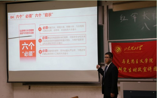 本次宣讲的主讲人是李莹和满宠。李莹主要介绍了红军长征的历史背景,并回顾了红军长征的历史过程,还结合影像资料重点讲述了红军长征过程中一些可歌可泣的人物与故事。满宠以“弘扬伟大长征精神,走好今天的长征路”为主题,主要从长征是四个“伟大远征”,长征精神五方面内涵,六个“必须”六个“启示”,走好今天长征路的六方面要求等五个方面进行了讲解,同时结合大量事例视频资料,与现场同学进行了积极互动交流,对习近平总书记的长征讲话行了深入学习研究。