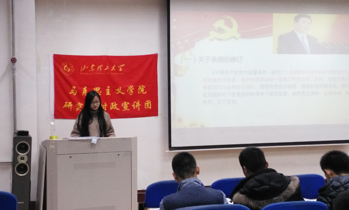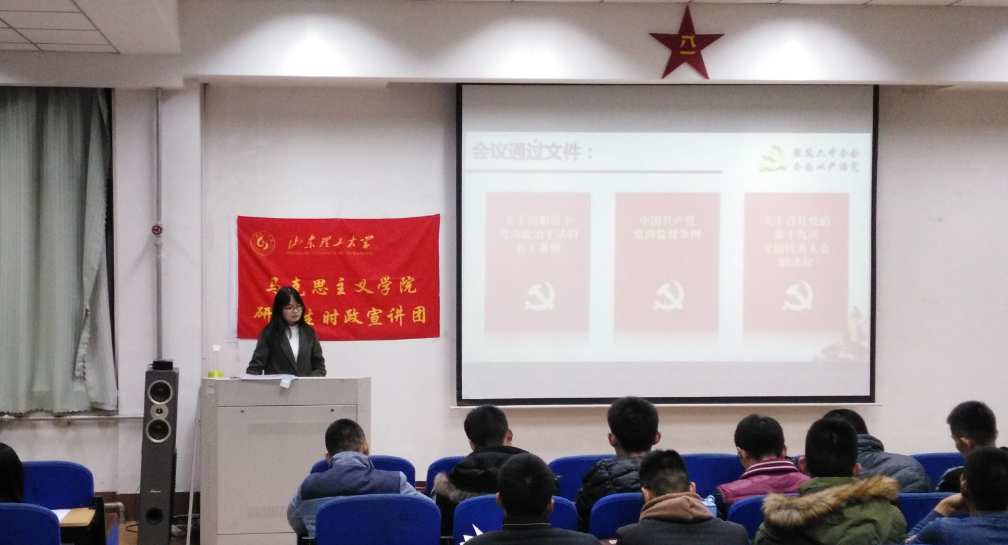 为深入学习贯彻党的十八届六中全会精神,推动学习宣传贯彻全会精神的热潮,我院研究生时政宣讲团应国防教育学院的邀请,于12月1日晚上在2号教学楼411教室宣讲十八届六中全会精神。?xml:namespace> 进行本次宣讲的是周钰和陈兆彤。两位宣讲人紧紧围绕习总书记重要讲话和两个文件,着重从“十二关键词解读六中全会、全面从严治党的准则遵循、加强党内监督、六中全会召开意义”四个方面,对十八届六中全会精神作了深刻解读和系统宣讲。