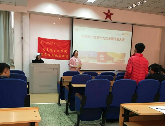 为深入贯彻落实党的十九大精神,加强领会习近平总书记讲话的重要内容,我院研究生时政宣讲团应体育学院的邀请,于11月9日下午两点在2号教学楼 教室为体育学院的全体同学们进行了以十九大精神为主题的时政宣讲。
