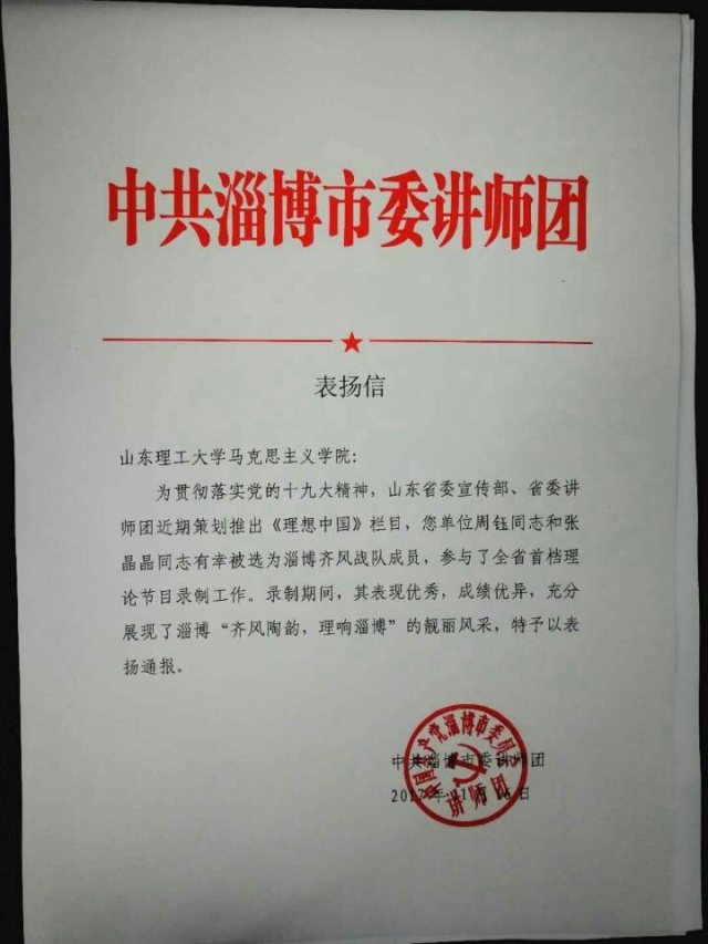 录制期间,我院学生认真努力、表现优异,充分展现了淄博“齐风陶韵,理想淄博”的靓丽风采,并获得了中共淄博市委讲师团的通报表扬。