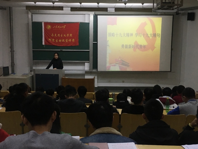 此次进行宣讲的主讲人是我院思想政治教育专业的张琪和马克思主义中国化专业的张乐乐。两位宣讲人结合自身专业优势,紧紧围绕宣讲主题,从党的光辉历程、十九大报告的主要内容、新成果的基本概括以及闭幕会的重要议程四个方面对十九大进行了系统的阐述和分析,期间更是带领全体学生党员重温入党誓词,做到不忘入党初心,牢记使命担当。