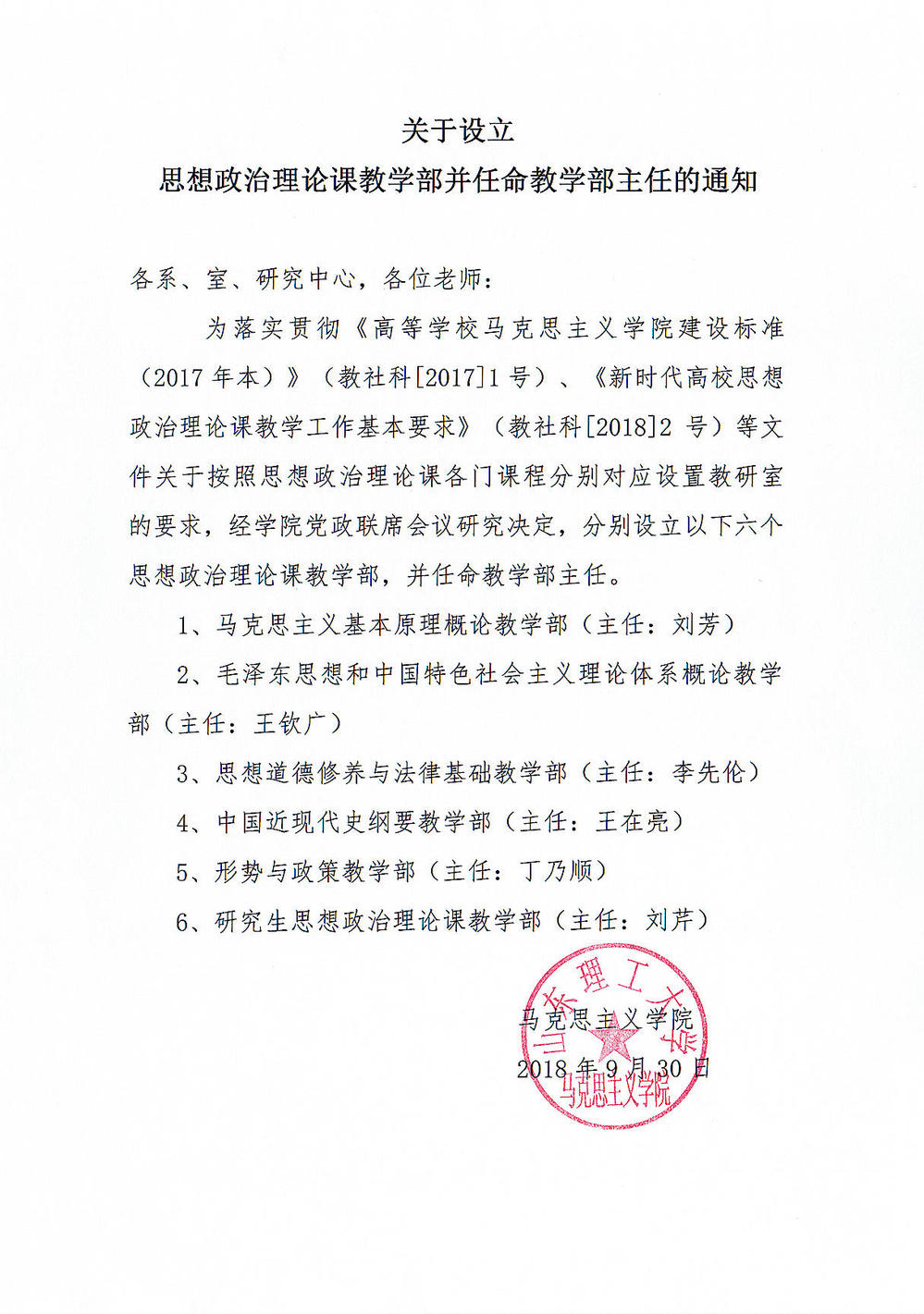 关于设立思想政治理论课教学部并任命教学部主任的通知