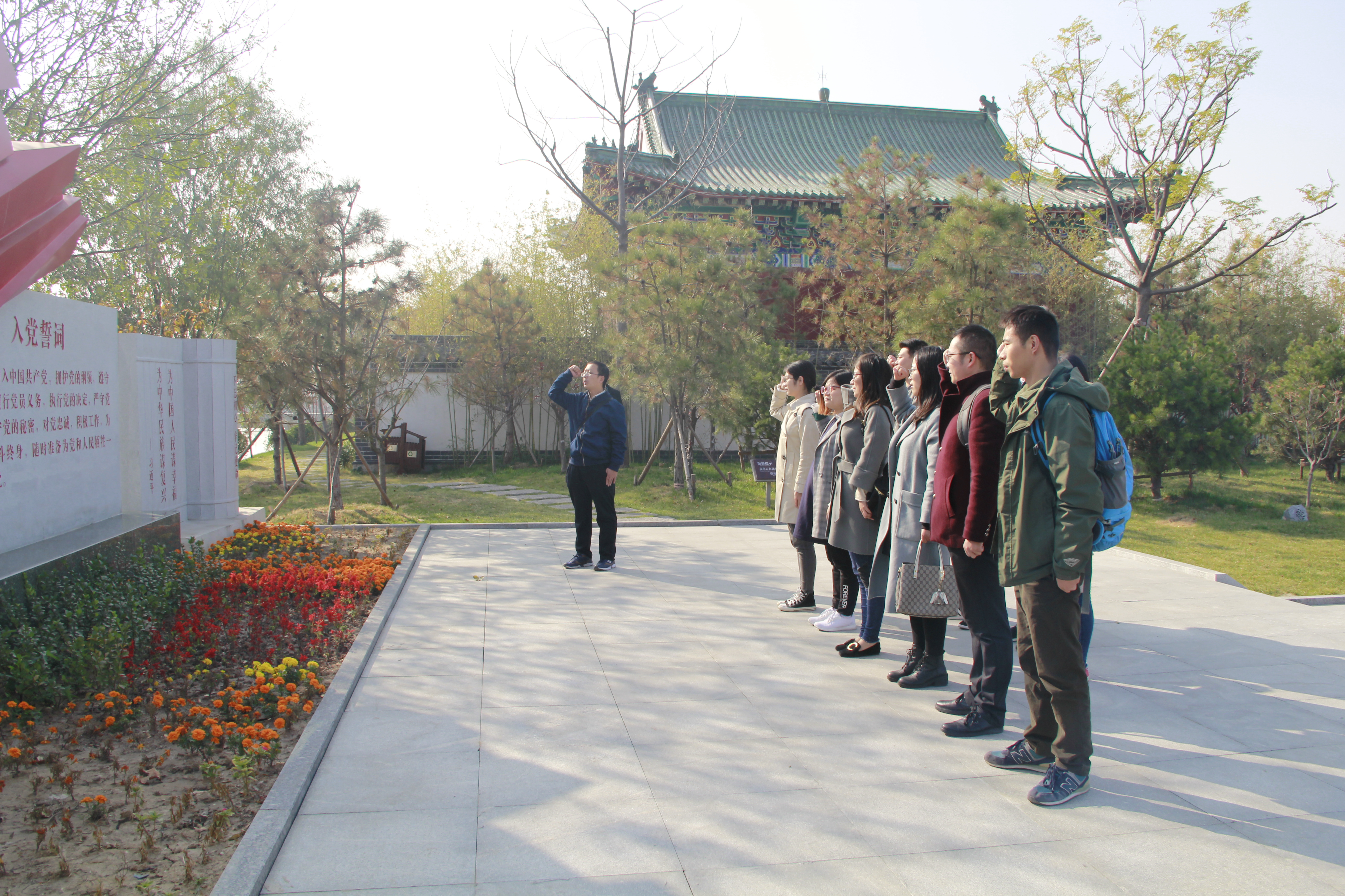 经过怀周广场,大家怀着无比崇敬的心情瞻仰周总理雕像,怀周祠中向周总理的雕塑三鞠躬,共同缅怀周总理不忘初心、鞠躬尽瘁的伟大一生。初心园里,党员们面对鲜红的党旗高举右手庄严宣誓,重温入党誓词。铮铮“誓言”再一次激起了大家赤诚的爱国情意和为人民服务的豪情壮志。