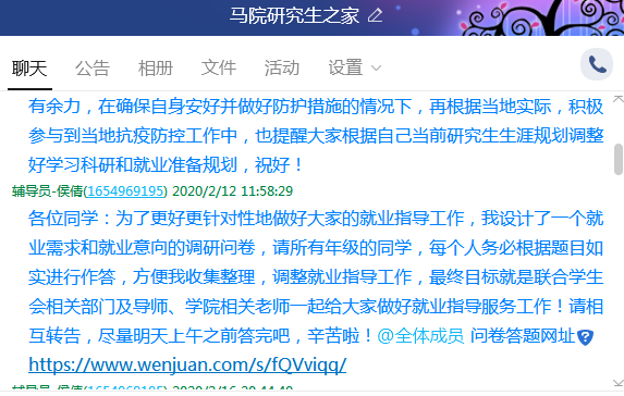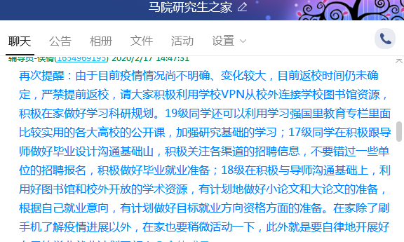 1月底,在学院响应学校疫情防控工作要求、出台了《williamhill英国防控新型冠状病毒感染的肺炎疫情工作预案》后,学院通过各年级学干定期摸排研究生居家防疫情况,及时传达落实上级疫情防控的教育管理要求。