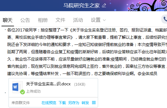 2月28日,学院将前期梳理汇总的《关于毕业生实名登记注册、签约、报到证派遣、档案邮寄、离校后就业手续办理等事宜常识》下发给2017级研究生,及时反馈和认真解答毕业生的困难疑惑,积极督促学生稳心态、促就业。