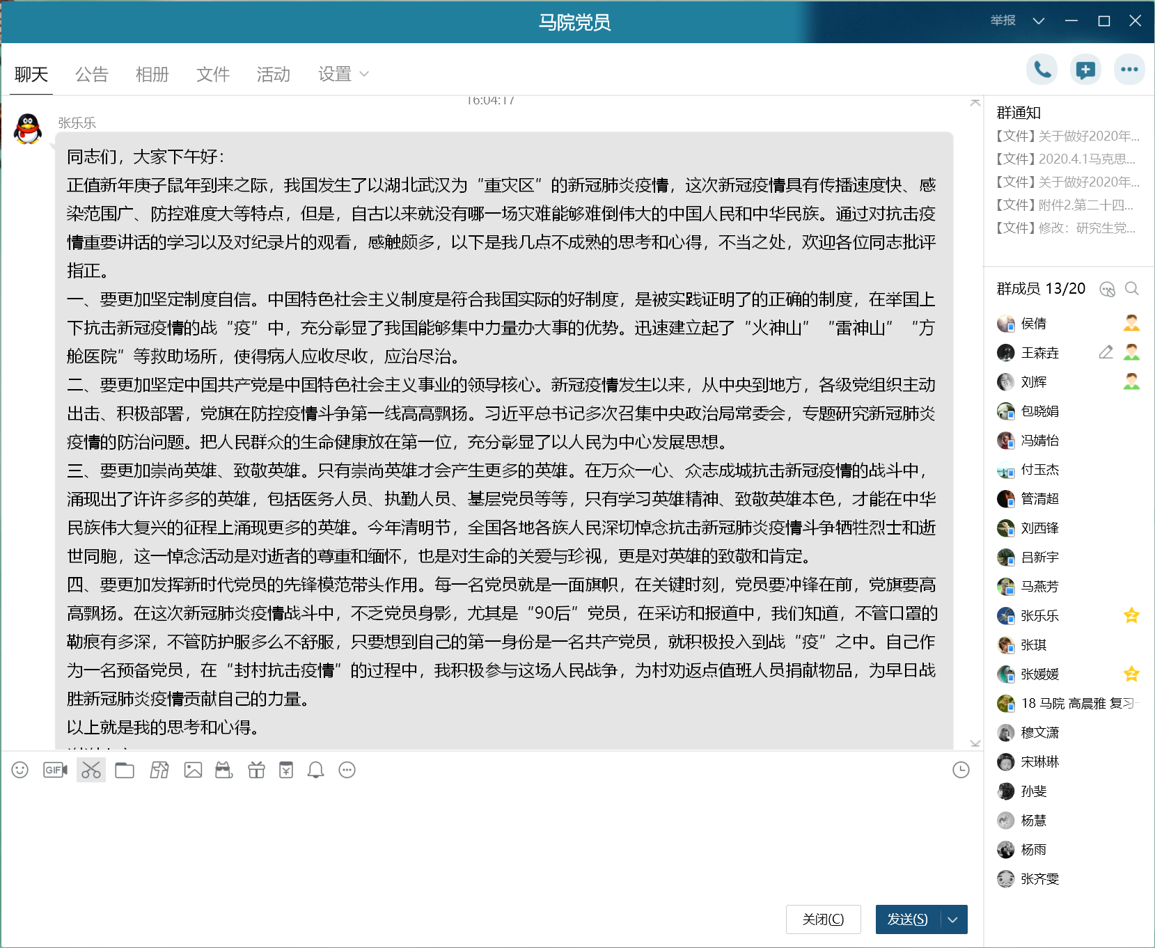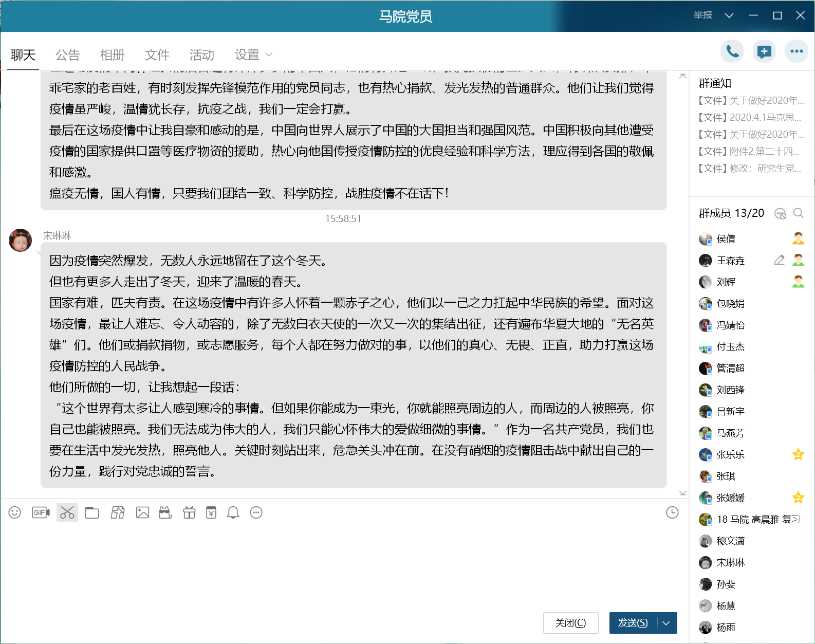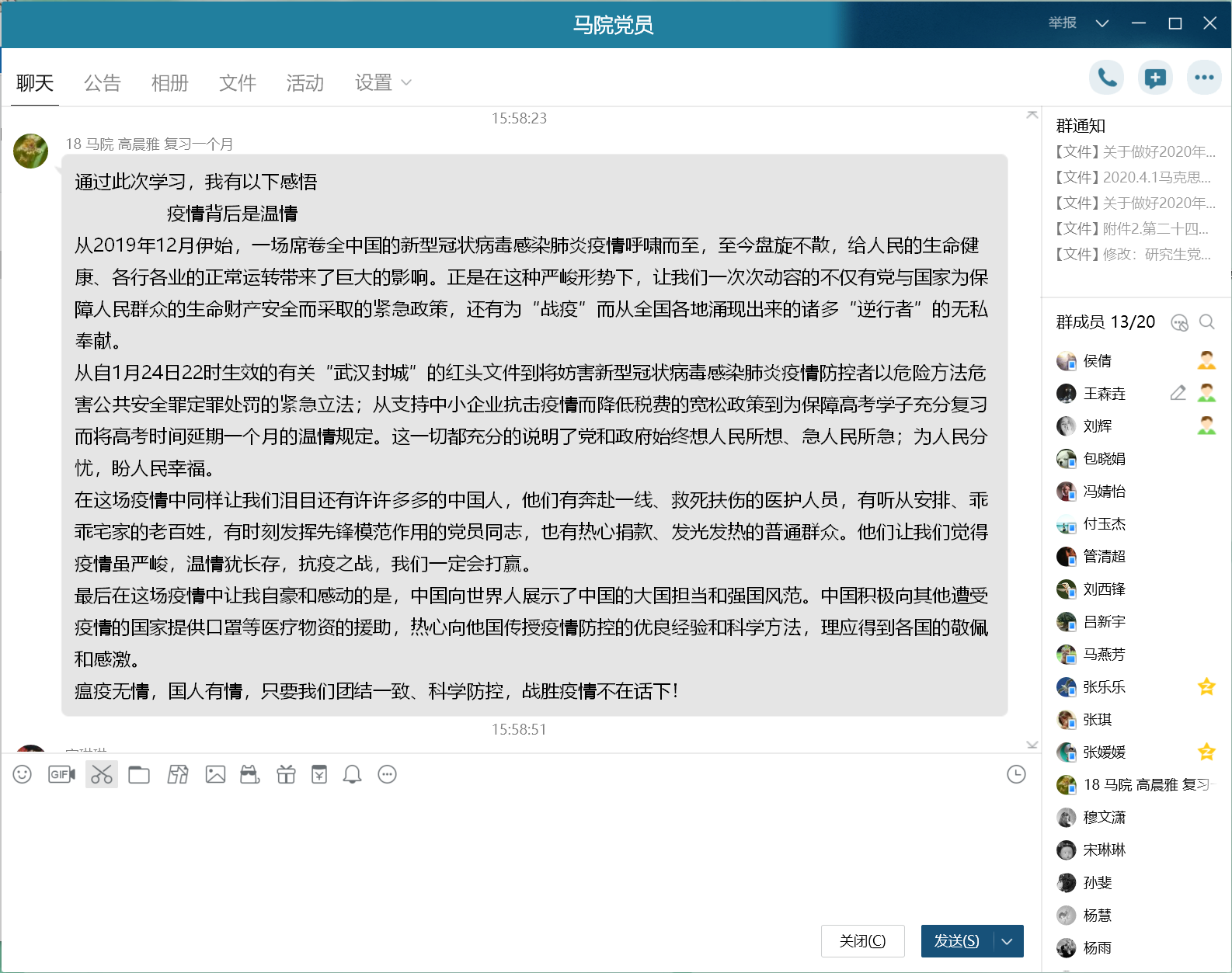 首先,支部全体党员集体观看纪录片《英雄之城》。一个个平凡而伟大的战“疫”故事在同学们面前展开,英雄们勇担使命的精神、立足岗位的坚守和保护生命的执著深深触动着支部每一位党员。随后,支部成员对纪录片展开热烈交流并分享学习心得,其中,硕1725班预备党员张乐乐、硕1845班预备党员高晨雅和硕1845班党员宋琳琳做重点发言交流。