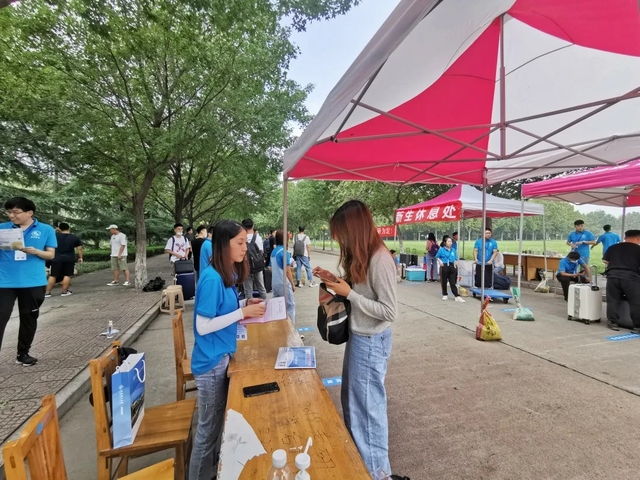 随着时间推移,新生们陆陆续续前来报到。整个迎新现场温馨热闹,迎新秩序有条不紊。