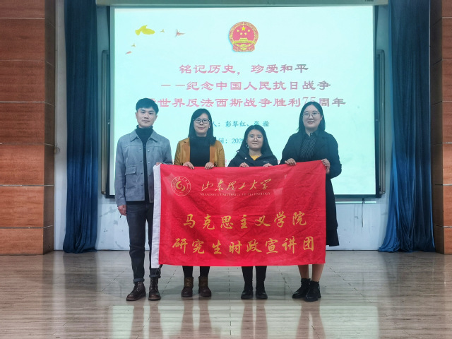 11月11日晚,我院研究生时政宣讲团于淄博职业学院南校区尚德楼学术报告厅开展了题为“铭记历史,珍爱和平——纪念中国人民抗日战争暨世界反法西斯战争胜利75周年”主题时政宣讲活动。活动得到淄博职业学院会计学院大力支持,淄博职业学院会计学院2020级百余名学生现场聆听。