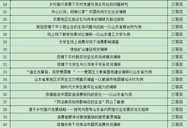 经过指导老师初选推荐,沈少华、何莹二位老师复评和第三轮集中答辩,2020年思想政治理论课实践教学优秀调研报告评选活动共评出一等奖5项,二等奖18项,三等奖28项。一等奖奖励800元,二等奖奖励600元,三等奖奖励400元。
