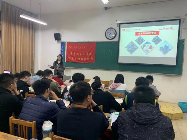 宣讲团成员张瀚、钟浩,向同学们讲述改革开放走过40余年中国的沧桑巨变。首先,钟浩通过列举建国以来的伟大成就、介绍改革开放的背景,阐明改革开放是决定当代中国命运的关键抉择。随后,张瀚对改革的原因、历程、成就进行讲述,点明新时代将改革进行到底的重要性和必要性。