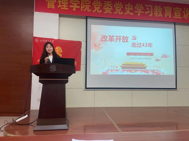 4月8日,我院研究生时政宣讲团成员分别联合管理学院7个学生党支部、资环学院2个学生党支部开展了题为“改革开放走过43年”的主题宣讲活动。宣讲团成员付佳艺、孙艺菡就改革开放43年来我国所取得的阶段性成果展开宣讲,呼吁同学们在改革开放的浪潮中放飞梦想、提升自我,为实现伟大复兴的中国梦贡献青年人的聪明才智。