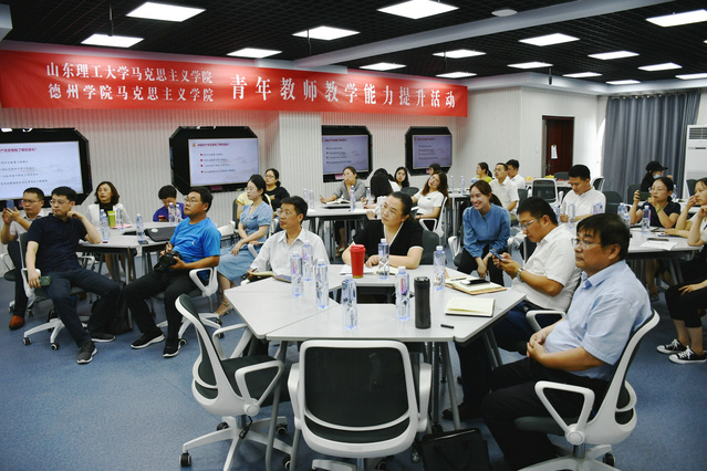 然后,在智慧教室开展了思想政治理论课集体磨课暨青年教师教学能力提升活动,双方青年教师进行教学展示和说课,双方领导、专家进行了热烈、直率、精彩的点评和指导,现场气氛活跃,严肃而生动,活动延续到12点多,老师们依然兴致盎然,不忍离去。