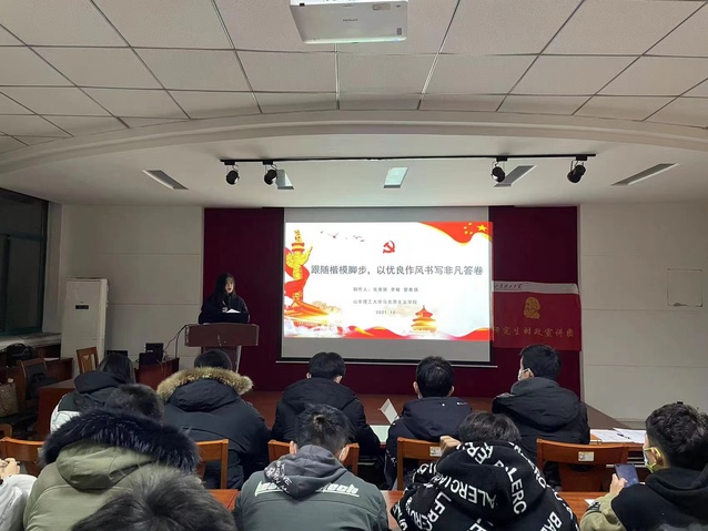 宣讲团成员张艳娇以习近平总书记在“七一”重要讲话中系统阐述“以史为鉴,开创未来,必须不断推进党的建设新的伟大工程”引入宣讲主题,聚焦党的作风建设这一主题,通过不同时期的党的作风建设和优秀楷模人物的事例,展开宣讲内容。宣讲回顾了党的作风建设在百年党史上的发展和创新,通过讲解典型楷模人物事例,引导参会人员从楷模身上汲取光辉力量,鼓励同学们在学习、工作和生活中严格要求自己,坚定理想信念,坚决遏制不正之风,争做不愧于党、不愧于国家的新时代青年;立足工作岗位,加强工作作风建设,在服务广大学生中谱写积极向上的青春之风。