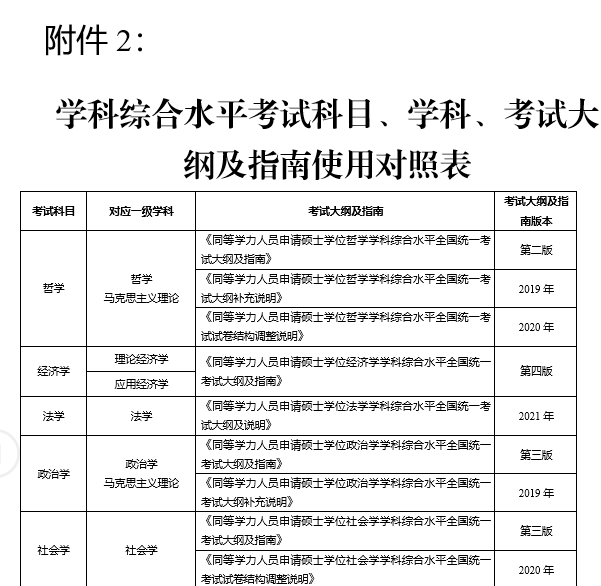 申请学科在附件2所列学科范围内的同等学力人员,须参加全国统一组织的学科综合水平考试,考试科目、所用考试大纲及指南见附件2。