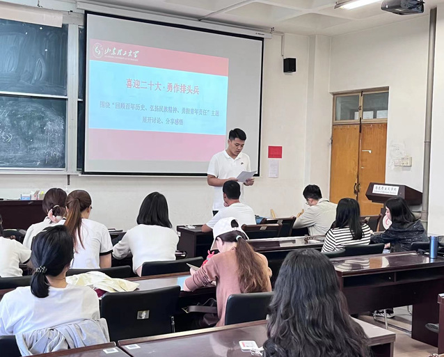 活动现场,同学们集体学习了习近平总书记在庆祝中国共产主义青年团成立100周年大会上的重要讲话精神。随后,在“喜迎二十大,勇作排头兵” 讨论分享环节,两位同学围绕“回顾百年历史、弘扬民族精神、勇担青年责任”主题展开分享感悟。