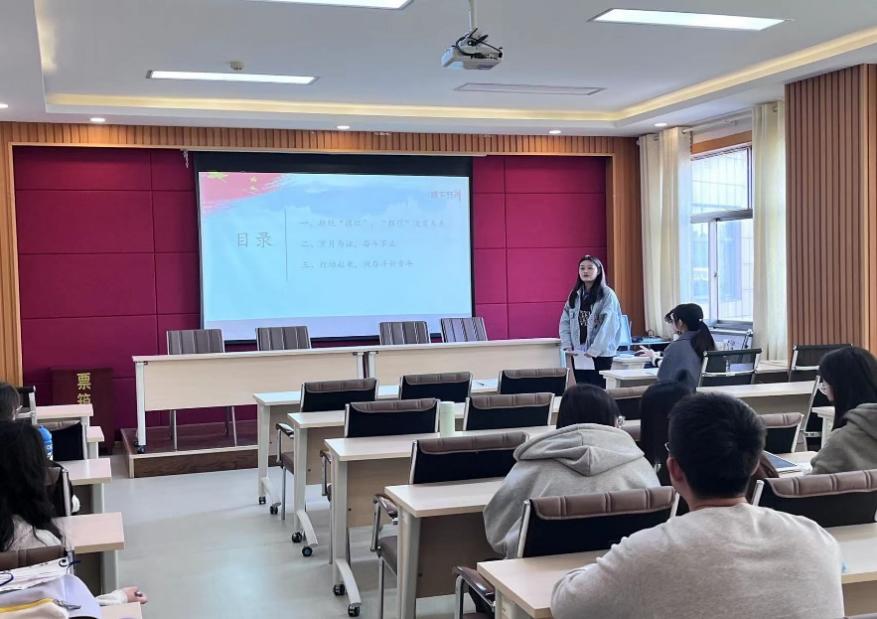 活动伊始,王洁简要介绍了活动流程。本次主题团日活动分为研究生时政宣讲团成员扈婷进行专题宣讲、观看视频《领航》及团员代表交流学习心得这三个环节。