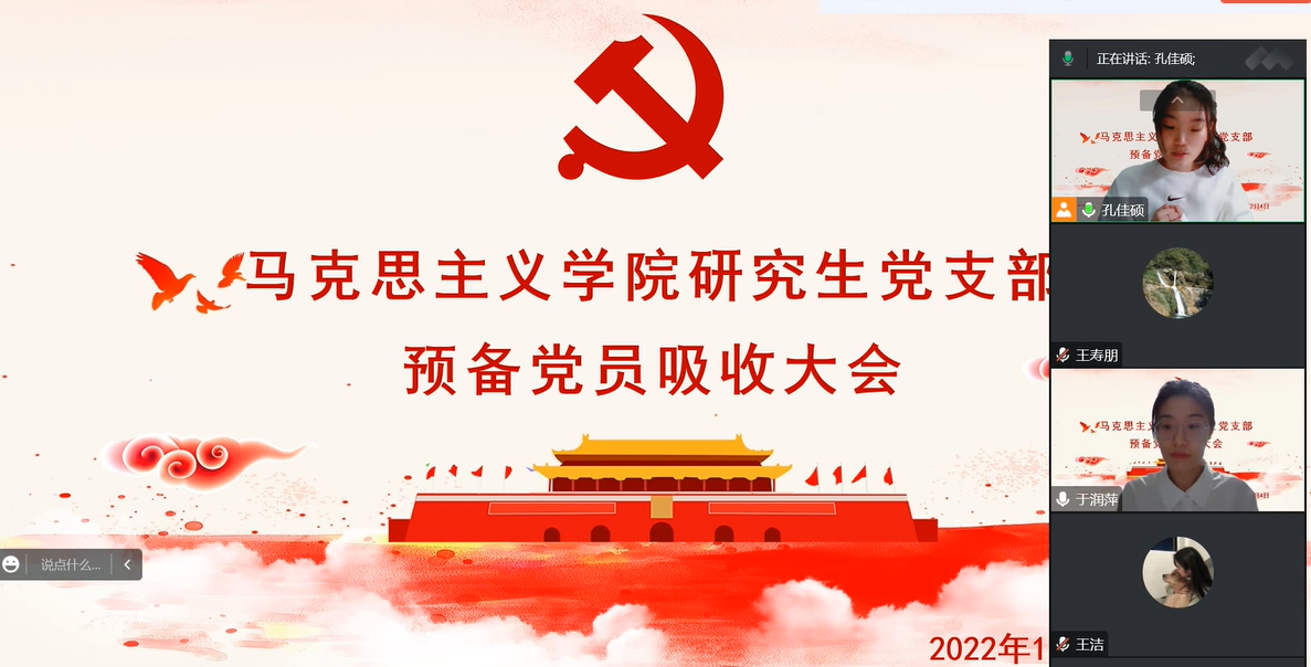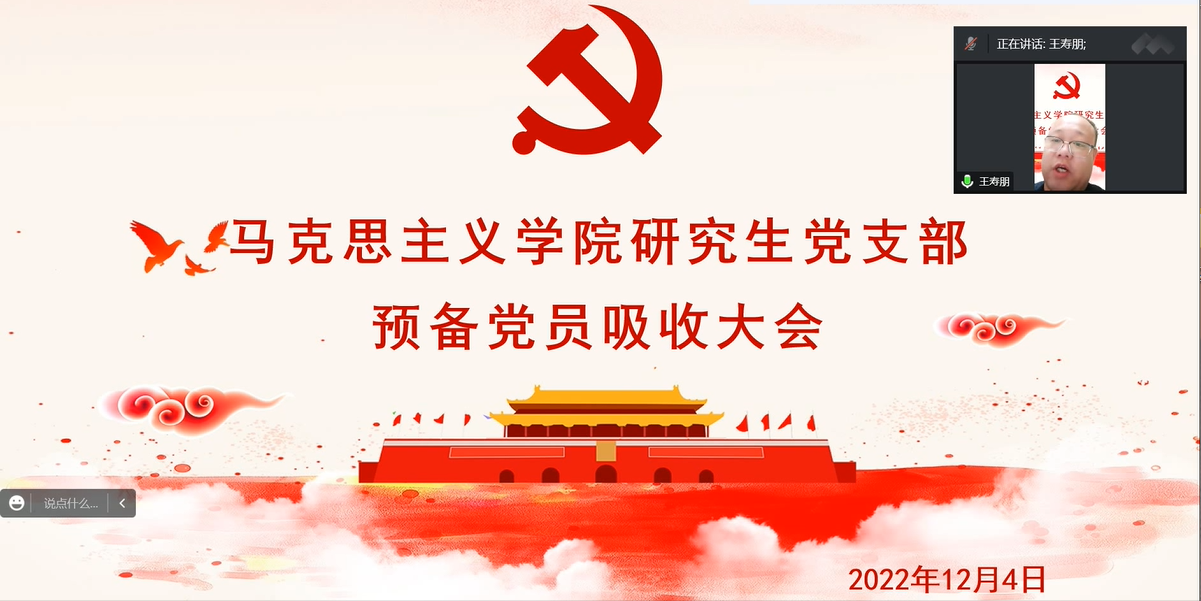 根据疫情防控形势和校党委组织部最新安排,12月4日晚上,我院研究生党支部召开了线上预备党员接收大会,支部书记王寿朋主持本次会议,学院党总支副书记宋伟列席会议,我院研究生党支部全体党员参加会议。