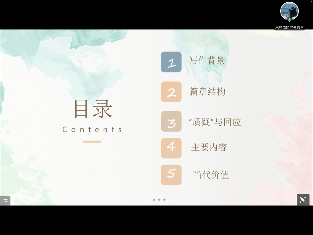 2月7日上午,学院举行第五期“稷下青马”读书会,活动采取线上的形式,本场读书会由2021级研究生来林杰担任主讲人,邀请学院刘芳老师担任点评教师,学院研究生会主席团成员李胜亚主持活动,2022级、2021级全体研究生参加。