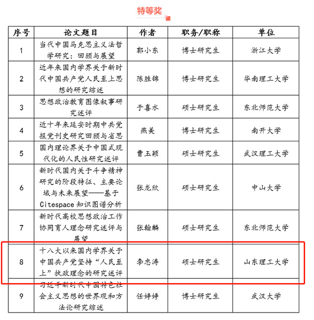 据悉,第九届全国马克思主义理论及相关学科文献综述大赛共收到参赛论文573份,经过校外专家匿名评审、学院核查,共评选出获奖论文131份,其中特等奖9篇、一等奖29篇、二等奖37篇、三等奖56篇。