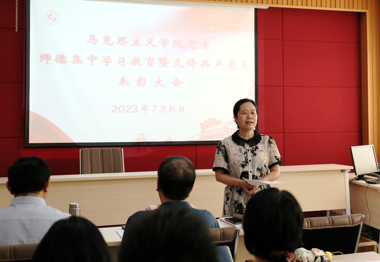 7月6日下午,学院党委师德集中学习教育暨先锋共产党员表彰大会在鸿远楼618室召开,大会以“师德集中学习教育”为主题开展学习,并对荣获2022-2023学年的先锋共产党员进行了表彰,学院领导班子、全体教职工、学生党员代表参加,学院党委副书记、副院长刘芹主持会议。