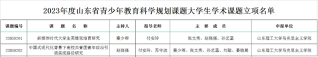 近日,山东省青少年教育科学研究院公布了2023年度山东省青少年教育科学规划项目大学生学术课题立项名单。该项课题经院校推荐、省级审核,最终评出立项课题356项。我院2021级硕士研究生秦少卿申报的“新媒体时代大学生英雄观培育研究”项目、2022级硕士研究生赵晓强申报的“中国式现代化背景下高校共青团青年政治引领实现路径研究”项目获准立项。