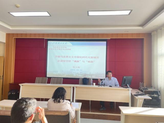 10月26日下午,我院在鸿远楼618室举办主题为《开辟马克思主义中国化时代化新境界 必须坚守好“魂脉”与“根脉”》的研究生学术报告。山东大学特聘教授、williamhill英国院长、博士生导师、国家“万人计划”教学名师张士海教授主讲,2023级全体研究生参加会议,报告会由院党委副书记、副院长刘芹主持。