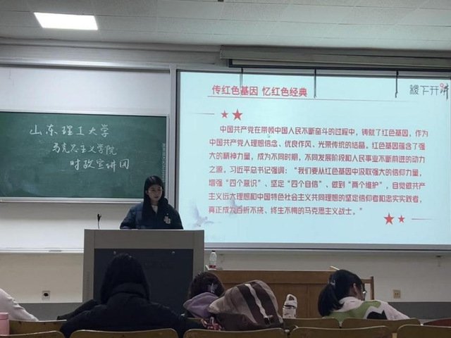 在法学院,宣讲团成员袁文佳、王慧敏围绕“讲红色基因,品丰富内涵”、“传红色基因,忆红色经典”、“承红色基因,做时代新人”三个方面进行阐述,引导同学们深刻理解红色基因的意义,号召大家传承红色基因,做时代新人,扬时代新风。