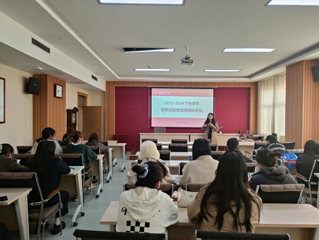 为推动2023-2024学年第二学期时政宣讲工作顺利开展,3月21日下午,我院于鸿远楼618室举行时政宣讲动员会。会议由研究生时政宣讲团团长扈婷主持,学院2023级全体研究生参加。