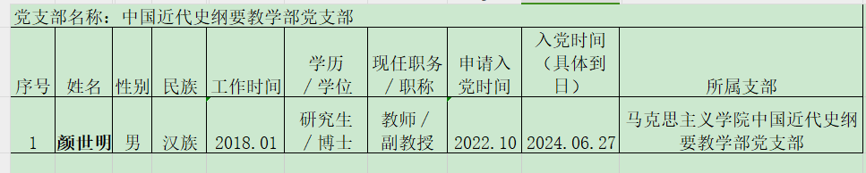 根据个人现实表现、党支部培养教育考察情况,拟将党员发展对象颜世明同志接收为中共预备党员。为进一步增强发展党员工作透明度,确保发展新党员的质量,按照校党委有关发展党员工作的制度规定,现对颜世明同志基本情况予以公示,公示期5天,自2024年6 月 27日—2024年 7月1 日。如有异议,请当面或通过书信、电话、电子邮件等方式反映,也可直接向校党委组织部反映,我们将为您严格保密。