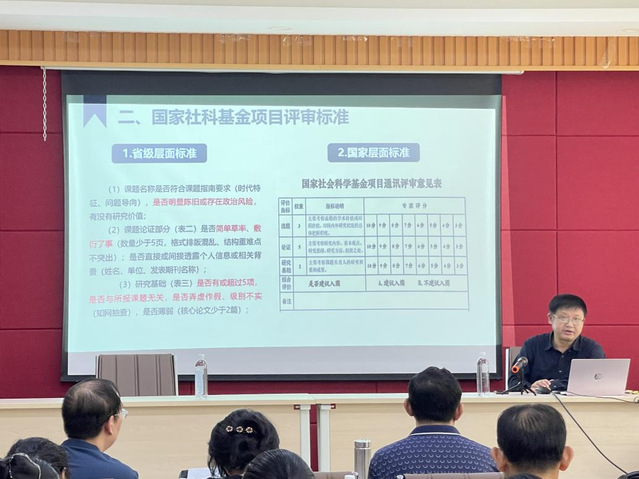 王习胜教授结合自身撰写国家社科基金项目申报的经历,以及参加项目评审的经验,从选题、框架思路以及前期基础等,对国家社科基金项目进行了全面、详实的讲解。他详细介绍了国家社科基金项目评审以及申请书的填写规范,并对此提出一些切实可行的建议。