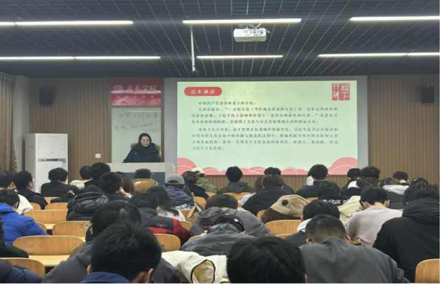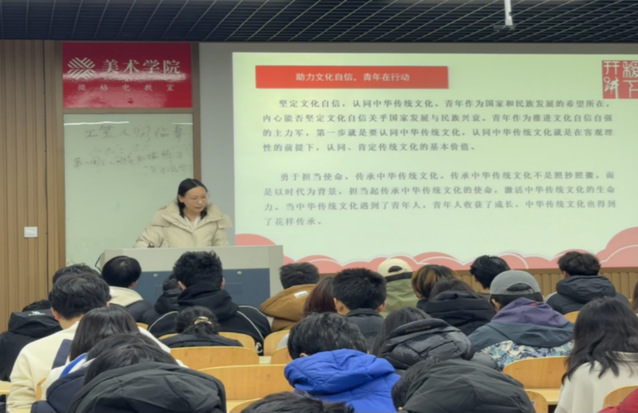 在美术学院,彭心怡、吴欣雨围绕着“追本溯源”、“论古今望未来”和“行应尽之责”三个方面展开宣讲,引领同学们重温中华民族优秀传统文化的迷人魅力,深入剖析坚定文化自信的重大意义,详细阐述了青年在这一伟大进程中的责任与担当,号召青年学生深入学习传统文化知识,积极参与文化传承与创新活动,在多元文化的碰撞交流中坚守本土文化精髓,以实际行动彰显文化自信。