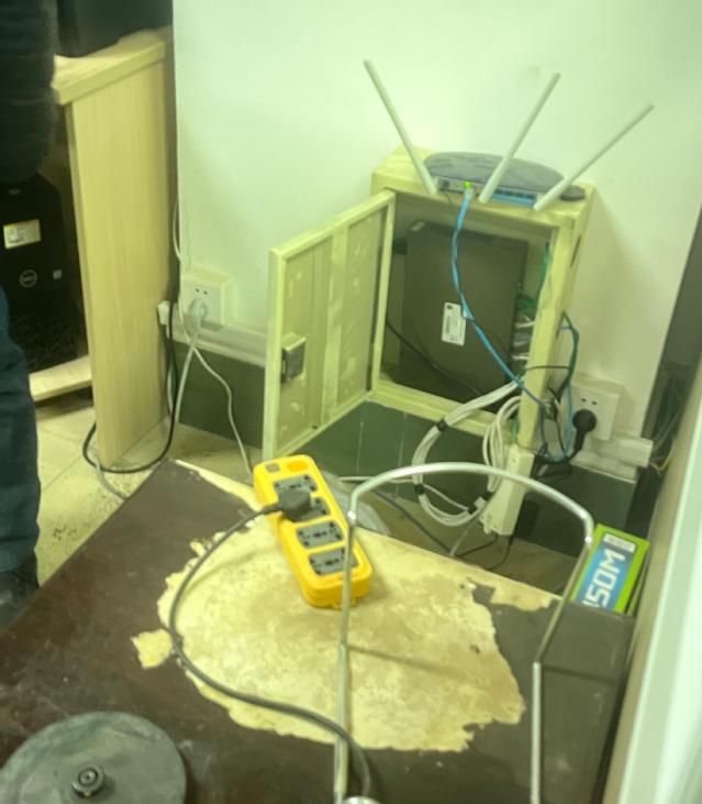 检查人员逐一对各房间的电器设备、消防器材及门窗锁具等设施进行了细致排查,发现了部分办公室存在离开设备未断电、电路老化、电线布局杂乱、管道渗水的安全隐患问题。针对上述问题检查人员立即作出处理,记录排查结果,制定相应整改措施。切断长期未使用设备电源,确保所有电器在不使用时已正确断电,将电路老化、电线布局杂乱以及管道渗水等问题上报相关部门,要求专业维修人员进行修复。此外,在排查过程中,还特别提醒教职工和学生注意个人网络行为和信息安全,加强自我保护和自我防范意识。