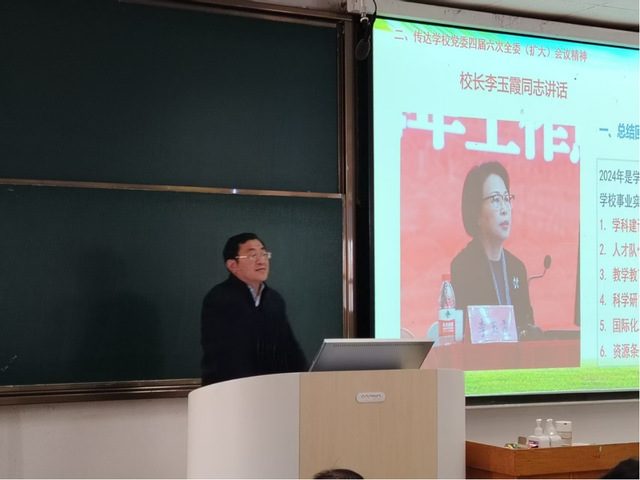 会议伊始,学院党委书记郭万保以饱满的热情和坚定的语气传达了校党委四届六次全委(扩大)会议暨2024年工作总结2025年工作部署会议的核心精神,强调了在新时代背景下,高校作为知识创新和社会服务的重要阵地,承担着培养高素质人才、推动科技进步和文化传承的历史使命。他要求全体教职工深刻领会会议精神,把握时代脉搏,将个人发展与学院乃至学校的发展紧密结合,共同书写教育事业新篇章。
