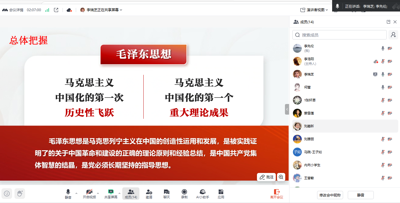 为进一步推动研究生教学实习规范化,切实提升实习研究生的教学能力和水平,3月16日晚,学院组织召集本学期第一批次在水利技师学院实习的8名研究生做了备课讲课集体评教指导会。会议由副院长李先伦主持,线上方式进行,围绕学生本学期所讲授的《思想道德与法治》《毛泽东思想和中国特色社会主义理论体系概论》两门课程,何莹、赵谦、王子如、张彤彤等4位教师参与指导。
