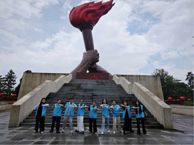 上午,实践团登上火炬广场参观学习。作为井冈山革命根据地的重要地标,这里的每一寸土地都镌刻着红色记忆。园内,火炬造型雕塑巍然矗立,寓意“星星之火,可以燎原”。实践团成员沿着红色步道拾级而上,沿途参观革命历史浮雕墙,仿佛穿越时空,置身于那段波澜壮阔的革命岁月。抚摸着历经沧桑的岩石,大家对“星星之火,可以燎原”的革命真理有了更鲜活的理解,也更真切体会到革命先辈在“敌军围困万千重,我自岿然不动”的困境中,那份坚韧不拔的斗争精神。