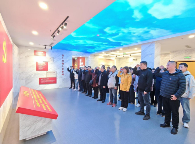 在展览馆前,全体党员师生一起重温入党誓词。“我志愿加入中国共产党……”铿锵誓言回荡在展馆中,彰显出党员们以楷模为镜、永葆政治本色的坚定决心。